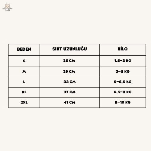 Sırt uzunluğunu enseden kuyruğa kadar ölçmelisiniz. Kilo ile örtüşmesi halinde o bedeni almanızı tavsiye ederiz.