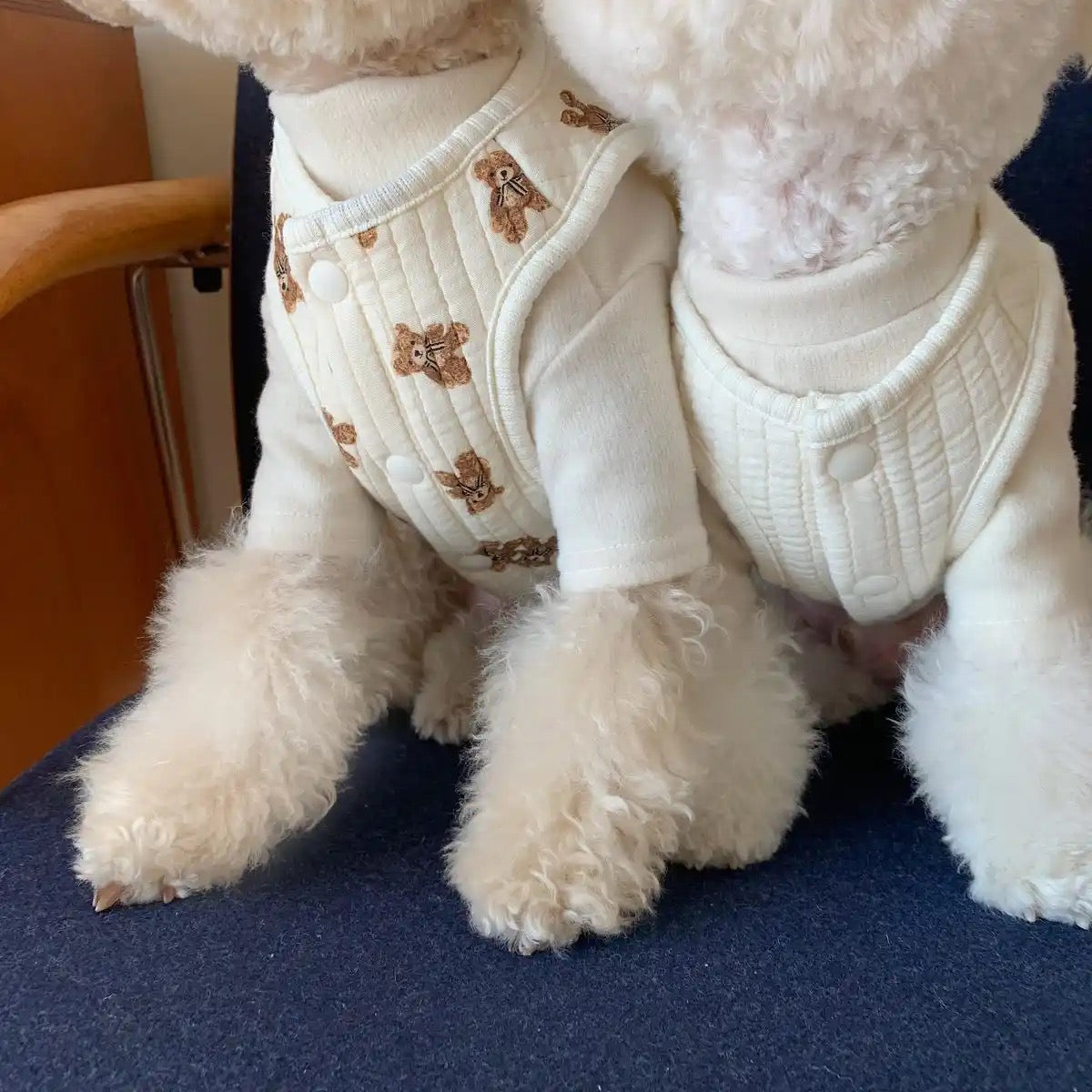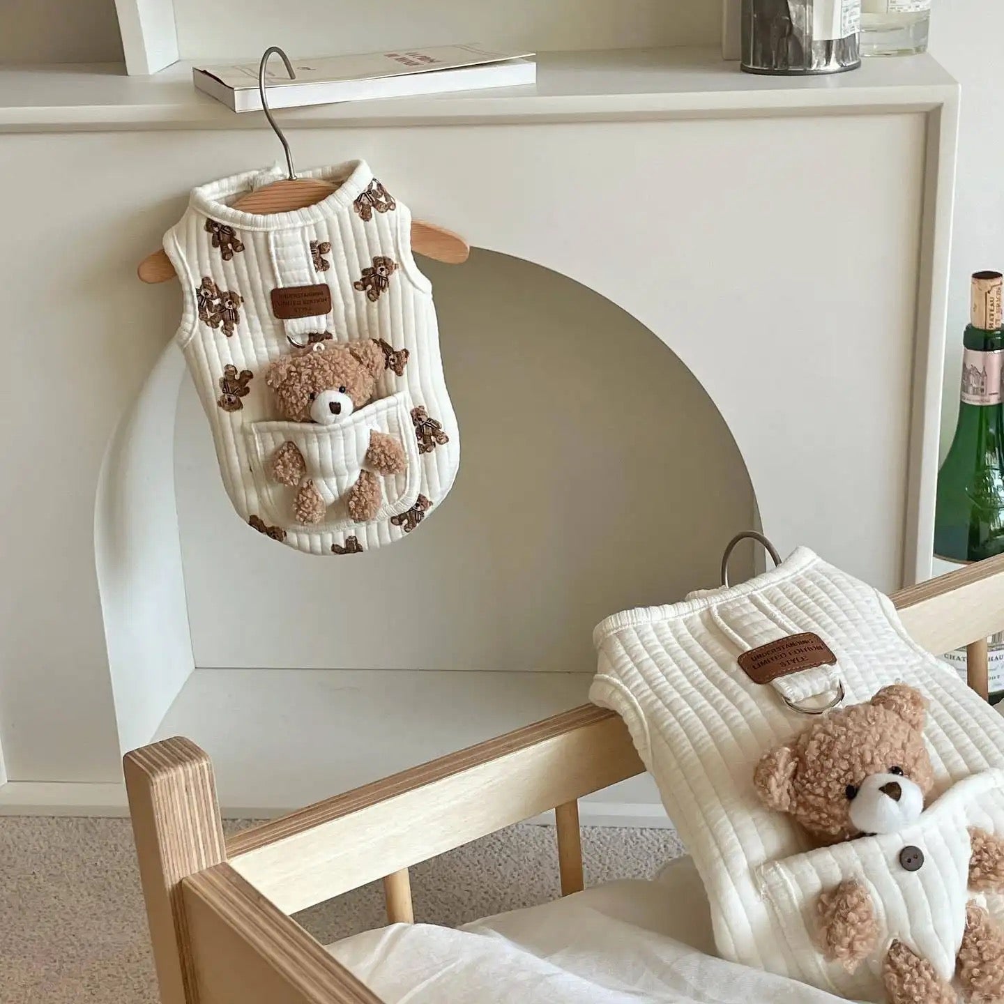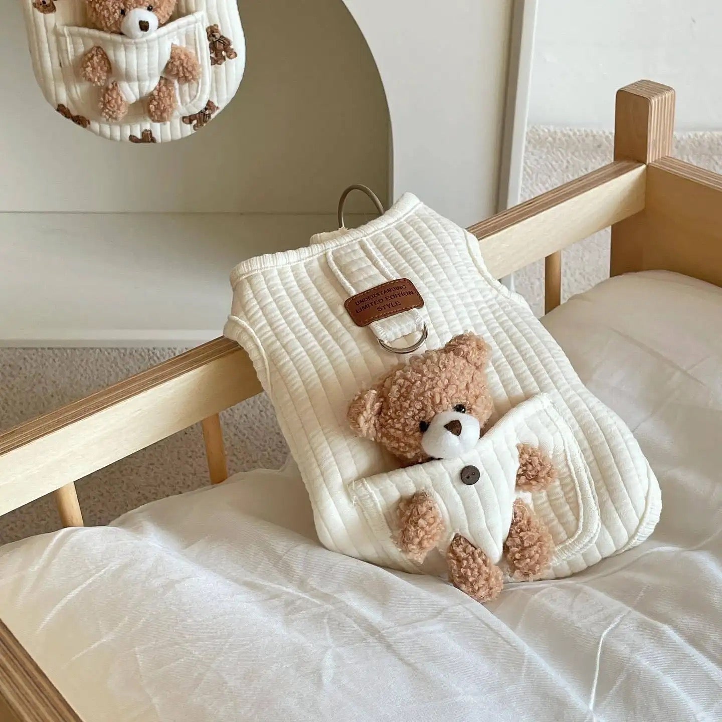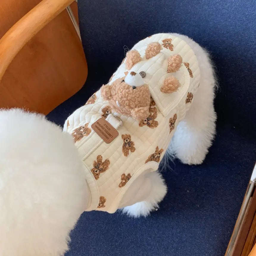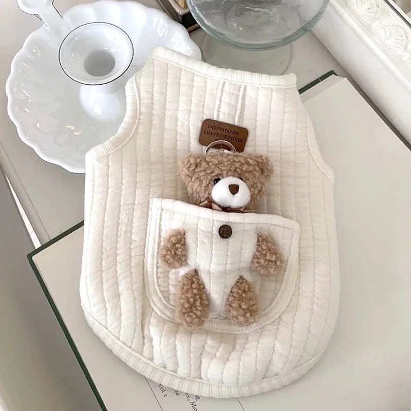 Bu kadar tatlı bir yelekte neler var ? Hem ayıcık oyuncak olarak çıkartılabiliyor, hem pamuklu bir yelek hem de tasma takıp dolaştırılabiliyor😍